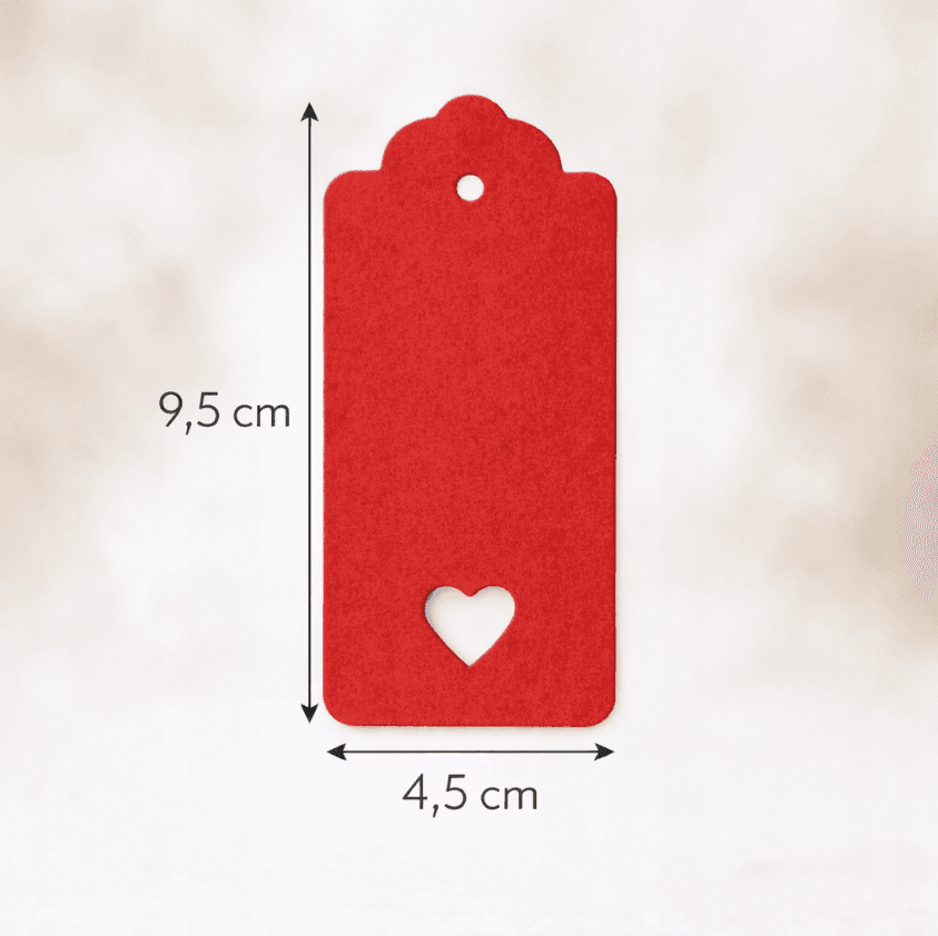ETYKIETY CZERWONE ZAWIESZKI BILECIKI DO PREZENTÓW 9,5 x 4,5 cm Z SERCEM. Zestaw 50 sztuk ze sznureczkiem ✅ Dodaj wyjątkowego charakteru swoim prezentom, produktom handmade i podziękowaniom dzięki eleganckim etykietom wykonanym z ekologicznego papieru kraft w kolorze czerwony. ✅ To drobny detal, który sprawia ogromne wrażenie – idealny zarówno do użytku domowego, jak i profesjonalnego pakowania upominków, dekoracji czy sprzedaży rękodzieła. Opis produktu: ✅ Wymiary etykiety: ok. 9,5 × 4,5 cm ✅ Kolor: czerwony ✅ Materiał: gruby papier o naturalnej fakturze ✅ Otwór: gotowy do przewleczenia sznurka, wstążki lub tasiemki ✅ Styl: minimalistyczny,, eko